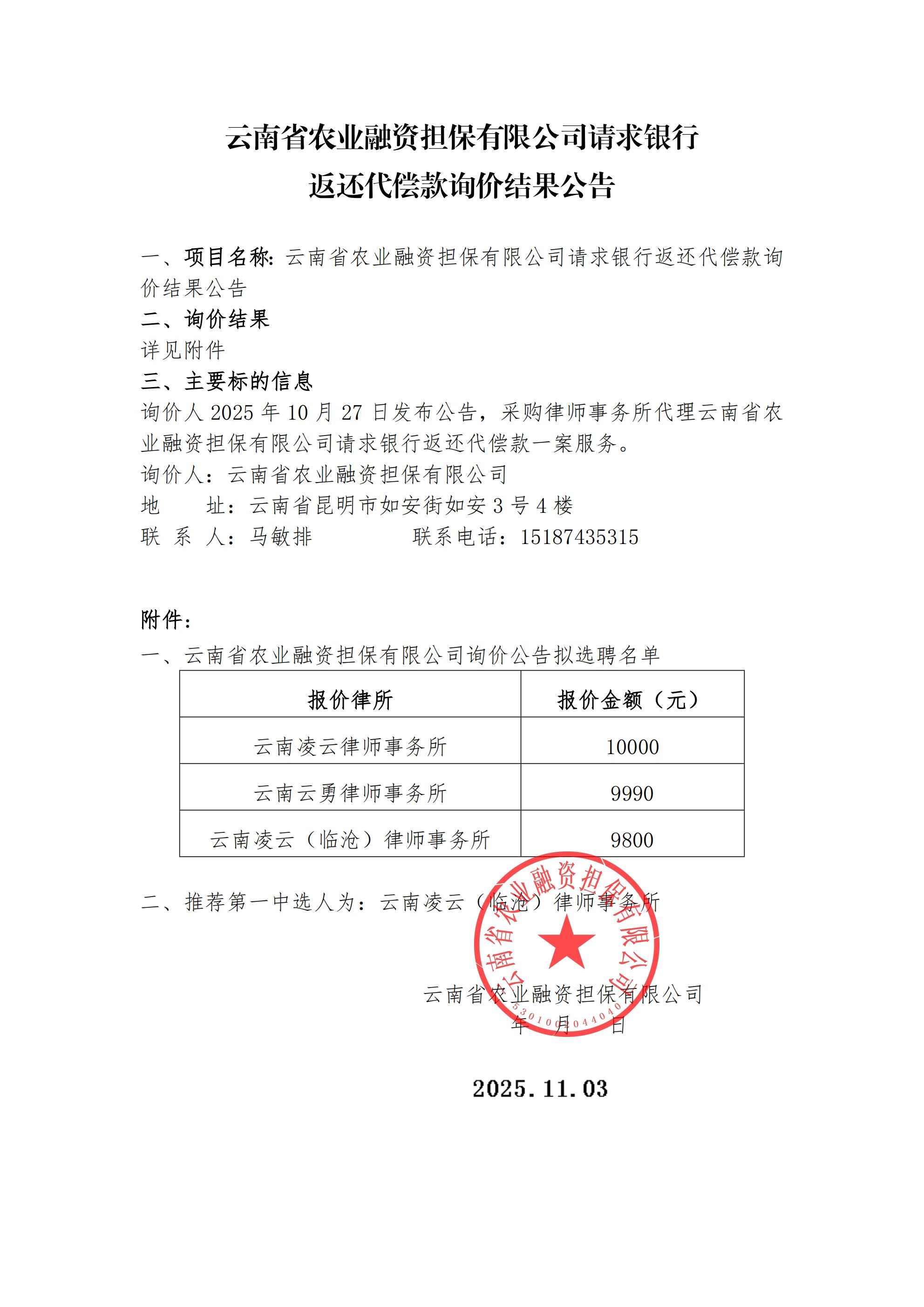 云南省農(nóng)業(yè)融資擔(dān)保有限公司請求銀行返還代償款詢價結(jié)果公告